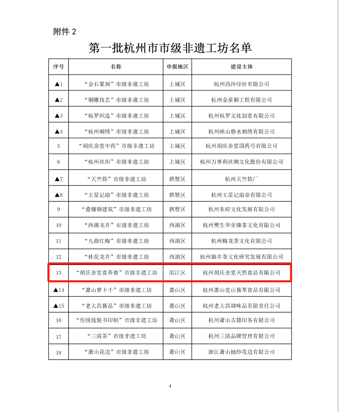 近日,杭州市文化廣電旅游局公布了第一批市級傳統工藝工作站、市級非遺工坊名單。經評審公示,我司“胡慶余堂食養膏非遺工坊”成功入選市級第一批非遺工坊。